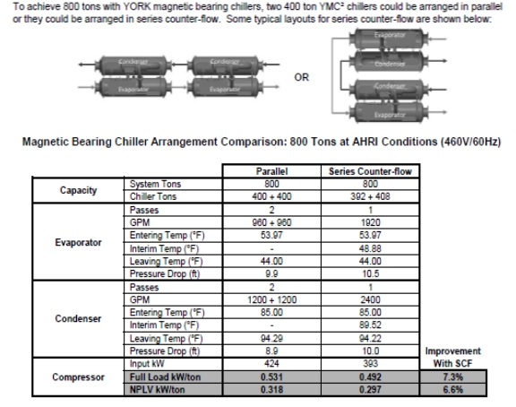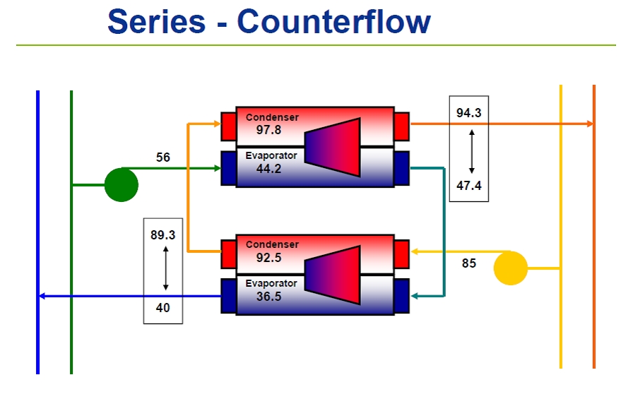 Aqui 2 exemplos com o resultado na simulação das máquinas: PARALELAS x SÉRIES E CONTRAFLUXO 2000 TR = 2 máquinas de 1000 TR