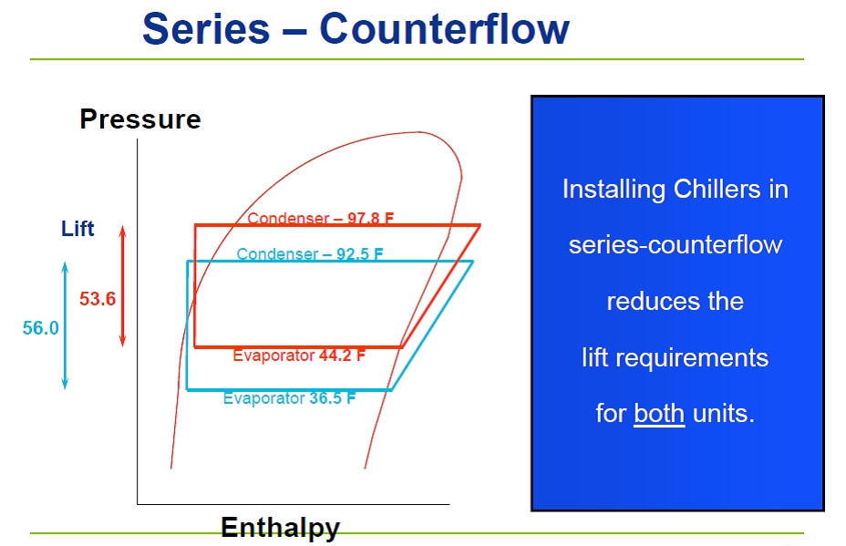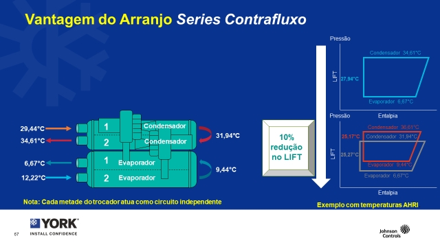 Quando é adotado o arranjo em série e o contrafluxo, as máquinas vão dividir o trabalh.o de forma tal que cada uma vai ter o seu lift diferente e menor na condição sequencial em que elas são chamadas no sistema. O trabalho mecânico é compartilhado e ocorre a redução do lift