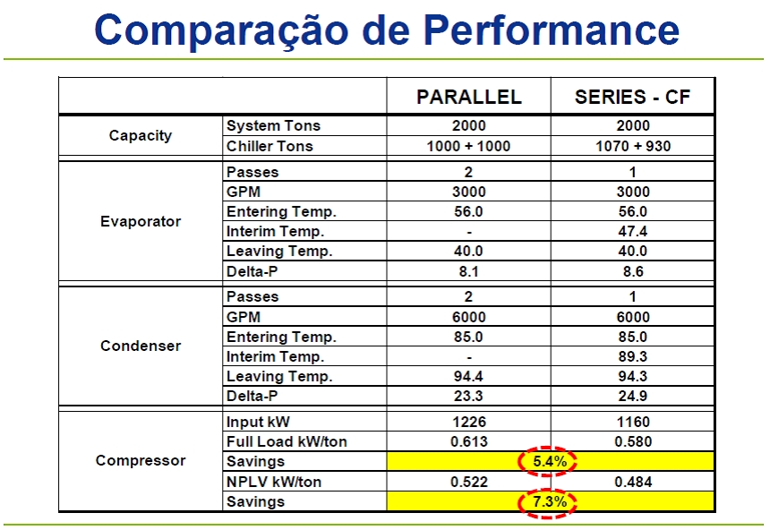 Sempre existe oportunidade de redução no consumo de energia na instalação, na faixa de 5 a 8%, adotando-se a solução com chillers no arranjo em série e contrafluxo ou na aquisição de máquinas com este conceito já incorporado.