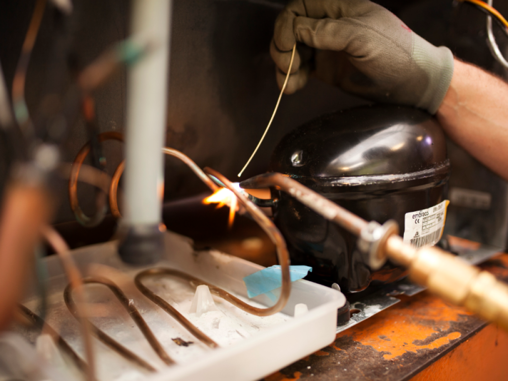 2. Mantenha o compressor limpo e seco – Durante as trocas de compressor ou a qualquer momento em que o sistema for aberto para manutenção, mantenha a tubulação de cobre limpa e seca. Sempre remova as rebarbas do tubo após os cortes, de preferência com uma ferramenta de rebarbação e não com canivete. Tome cuidado para fazer cortes que evitem que os pequenos pedaços de cobre caiam na tubulação. Use um aspirador quando isso acontecer. Os detritos no sistema podem obstruir o tubo capilar ou ainda serem succionados pelo compressor, o que aumenta o risco de travamento deste componente. O ar contém umidade. Por isso, é muito importante evitar que a tubulação do sistema fique aberta por mais de 15 minutos. Dessa forma, evitam-se os danos causados por umidade no óleo lubrificante. Apenas remova os tampões dos conectores do compressor no momento da brasagem dos tubos. Uma prática recomendada durante a brasagem é injetar nitrogênio na tubulação a uma pressão de 2 a 3 psi, para remover todo o oxigênio e impurezas contidos na tubulação. Como as válvulas reguladoras normais de cilindros de gás não são indicadas para esse fim, podem ser usados reguladores especiais para nitrogênio disponíveis no mercado.