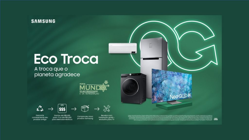 A Samsung acaba de divulgar a expansão do seu programa de descarte sustentável: o Eco Troca1. Lançado este ano, a iniciativa tem por objetivo incentivar o descarte correto de aparelhos eletrodomésticos e eletrônicos, dando ao consumidor a possibilidade de trocar seu equipamento – de qualquer marca e em qualquer condição – por um cupom de desconto para compra de um novo produto na loja oficial da Samsung. “A ampliação do Eco Troca caminha em sinergia com o compromisso da Samsung com a preservação do meio ambiente e o desenvolvimento sustentável, incluindo nossa linha de monitores e a mais recente categoria de eletrodomésticos da marca, as lava-louças. Nossa missão é sempre trazer novas tecnologias para a vida das pessoas com o mínimo de impacto ambiental possível”, reforçou Thiago César, diretor de marketing da divisão de Consumer Electronics da Samsung Brasil. Na primeira fase, o programa aceitava geladeiras, máquinas de lavar, condicionadores de ar e TVs, fornecendo vouchers de desconto de até 5 mil reais dependendo do produto. Agora o Eco Troca também aceita lava-louças e monitores, trazendo mais alternativas para quem deseja renovar os aparelhos da casa e ainda ajudar o meio ambiente. Os descontos vão de até R$700,00 para lava-louças e de até R$ 1.200 para os monitores. Para participar, basta acessar https://shop.samsung.com/br/ecotroca e obter o cupom de desconto na loja oficial da Samsung após agendar a coleta do produto antigo de grande porte. No caso dos monitores, o consumidor receberá informações do envio por correios ou entrega em pontos de coleta.