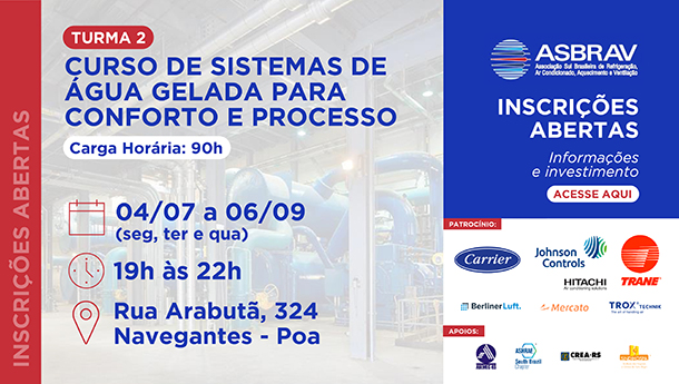 OBJETIVO: Oferecer conhecimentos básicos e intermediários em SAG (Sistemas resfriamento por água gelada) com foco nas aplicações de conforto e processo, uso, instalação, aspectos dos projetos e eficiência energética.