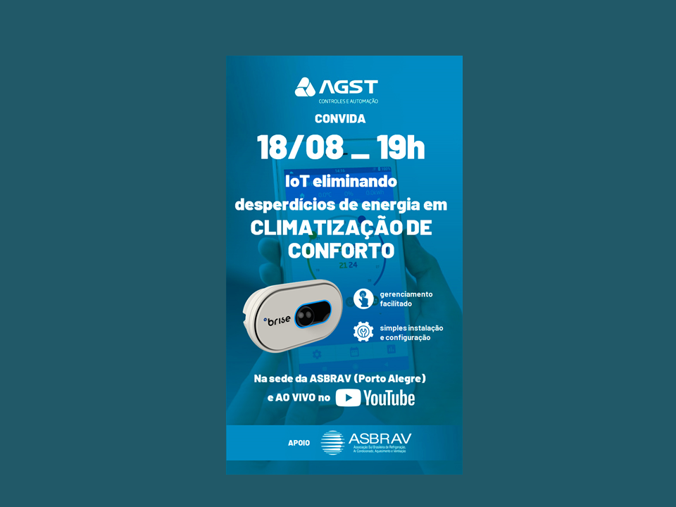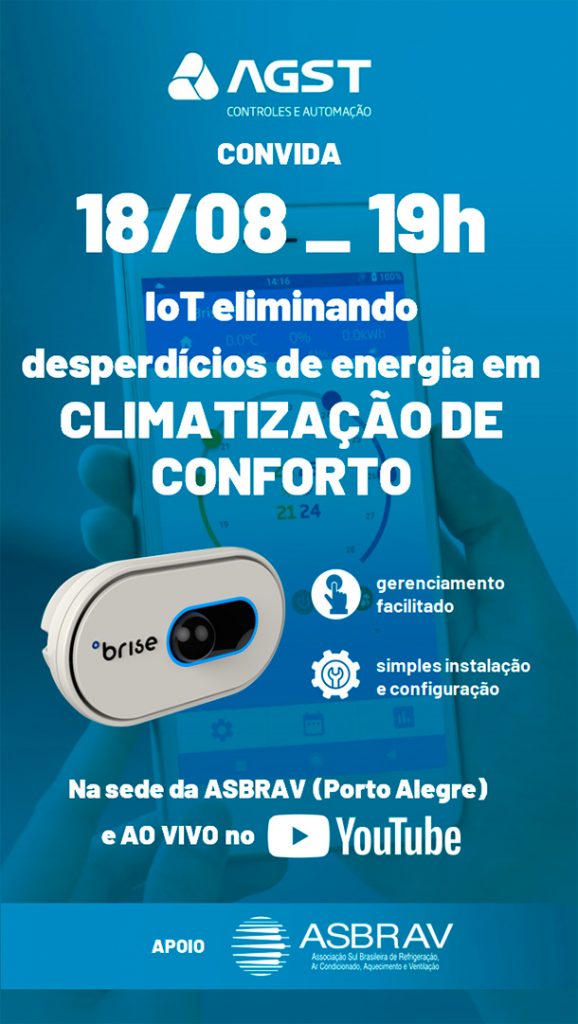A AGST Controles e Automação convida para a palestra BRISE: IoT eliminando desperdícios de energia em climatização de conforto, que será realizada no próximo dia 18, a partir das 19h, na sede da Asbrav, apoiadora do evento. A iniciativa tem como público-alvo os instaladores, projetistas, fabricantes, consultores, usuários finais, técnicos e engenheiros do mercado de HVACR (Aquecimento, Ventilação, Ar-Condicionado e Refrigeração). O evento será em modalidade híbrida, com vagas presenciais, mas também transmitido ao vivo via YouTube. A palestra é gratuita, no entanto as inscrições devem ser antecipadas e para o formato presencial as vagas são limitadas. A Asbrav informa que após a palestra será oferecido aos participantes o tradicional churrasco de confraternização.